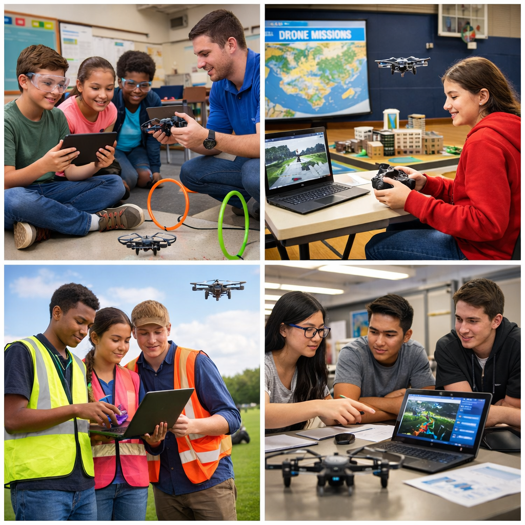 Programs are tailored to specific grade bands (elementary, middle, and high school) and align with classroom learning objectives while emphasizing creativity, critical thinking, and real-world applications. Safety, responsible drone operation, and digital citizenship are integrated throughout the curriculum, helping students build both technical skills and confidence as they explore emerging technology.